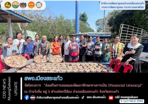 นางสาวปาณิสรา ปาณิสราภิรมย์ พัฒนาการอำเภอเมืองสระแก้ว มอบหมาย นางสาวณัฐกานต์ ปัญญาใสนักวิชาการพัฒนาชุมชนปฏิบัติการ ลงพื้นที่จัดโครงการ “ส่งเสริมการออมและพัฒนาทักษะทางการเงิน (Financial Literacy)” ให้ความรู้ด้านการบริหารจัดการทางการเงินแก่ประชาชน มีเป้าหมายเพื่อเสริมสร้างวินัยทางการเงิน ส่งเสริมการออม และสนับสนุนกลุ่มออมทรัพย์เพื่อการผลิตให้เป็นเครื่องมือในการพึ่งพาตนเองของครัวเรือน