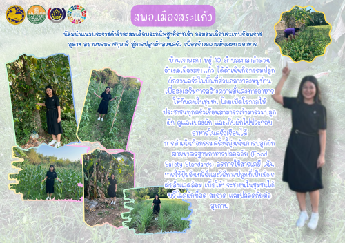 นางสาวปาณิสรา ปาณิสราภิรมย์ พัฒนาการอำเภอเมืองสระแก้ว มอบหมายให้ นางสาวสุชาดา ประทังคำ นักวิชาการพัฒนาชุมชนปฏิบัติการ ลงพื้นที่ติดตามและสนับสนุนการน้อมนำแนวพระราชดำริของสมเด็จพระกนิษฐาธิราชเจ้า กรมสมเด็จพระเทพรัตนราชสุดาฯ สยามบรมราชกุมารี สู่การปลูกผักสวนครัว เพื่อสร้างความมั่นคงทางอาหาร ภายในพื้นที่บ้านเขามะกามีการดำเนินกิจกรรมปลูกผักสวนครัวในพื้นที่ส่วนกลางของหมู่บ้าน เพื่อส่งเสริมการสร้างความมั่นคงทางอาหารให้กับคนในชุมชน โดยเปิดโอกาสให้ประชาชนทุกครัวเรือนสามารถเข้ามาร่วมปลูกผัก ดูแลแปลงผัก และเก็บผักไปประกอบอาหารในครัวเรือนได้