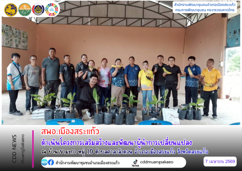 นางสาวปาณิสรา ปาณิสราภิรมย์ พัฒนาการอำเภอเมืองสระแก้ว มอบหมายให้ นายปรีดี ล้ำจุมจัง เจ้าพนักงานพัฒนาชุมชนชำนาญงาน ลงพื้นที่ดำเนินโครงการเสริมสร้างและพัฒนาผู้นำการเปลี่ยนแปลง (ครู ข) โดยมีผู้นำการเปลี่ยนแปลงเข้าร่วมจำนวน 13 คน