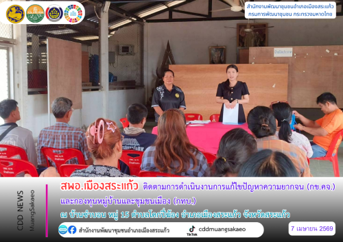 นางสาวปาณิสรา ปาณิสราภิรมย์ พัฒนาการอำเภอเมืองสระแก้ว มอบหมายให้ นางสาวณัฐกานต์ ปัญญาใส นักวิชาการพัฒนาชุมชนปฏิบัติการ พร้อมด้วย นางพยอม เหง่าพันธ์ เจ้าหน้าที่ประสานงานกองทุนหมู่บ้าน ลงพื้นที่ติดตามการดำเนินงานกองทุนแก้ไขปัญหาความยากจน (กข.คจ.) และกองทุนหมู่บ้านและชุมชนเมือง (กทบ.)